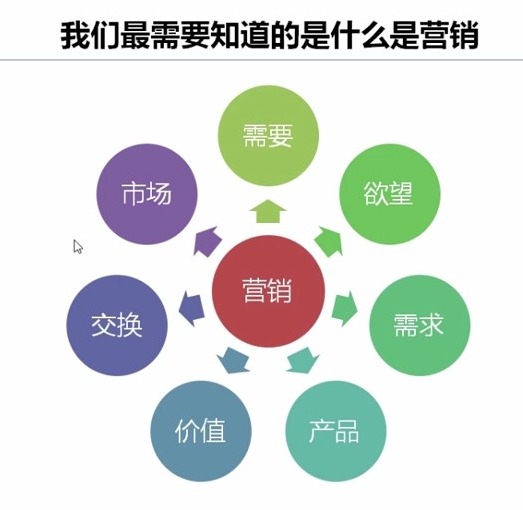 (1)需要 (2)慾望 (3)需求 (4)產品 (5)價值 (6)交換 (7)市場
