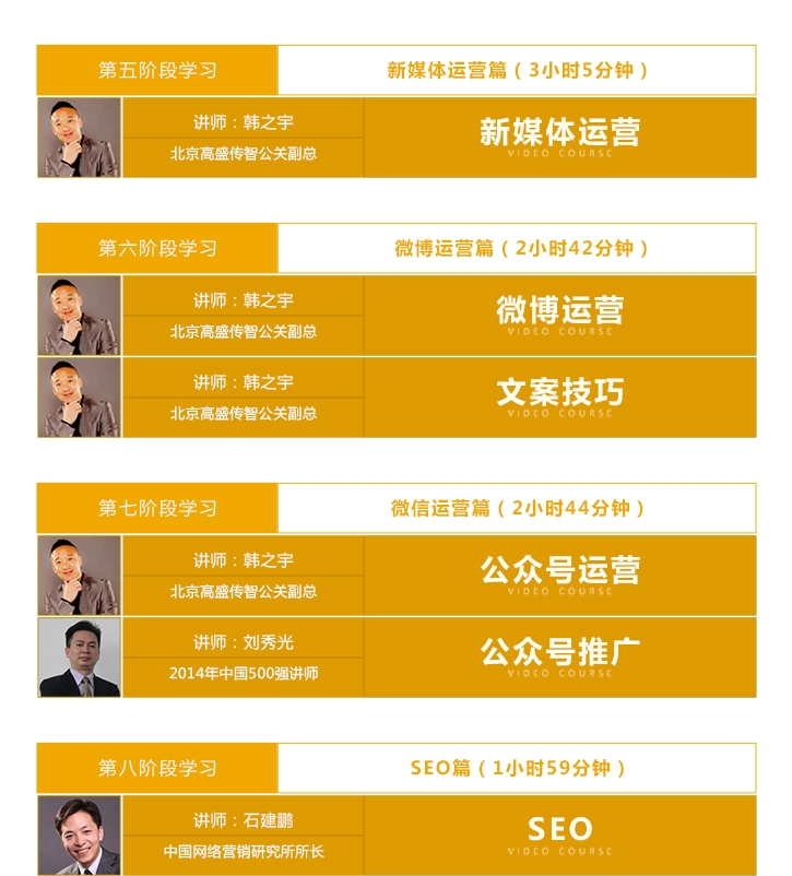 1【微信文案】微信文案實戰寫作技能培訓(上) →00:33:53 2【微信文案】微信文案實戰寫作技能培訓(下) →00:35:52 3【微信營銷】實用的微信營銷九步法(上) →00:30:58 4【微信營銷】實用的微信營銷九步法(中) →00:35:33 5【微信營銷】實用的微信營銷九步法(下) →00:37:44 6【互動活動】五大互動方法玩轉微信營銷活動 →00:19:38 7【節日營銷】微信節日營銷怎麼做(上) →00:21:48 8【節日營銷】微信節日營銷怎麼做(中) →00:12:18 9【節日營銷】微信節日營銷怎麼做(下) →00:17:39