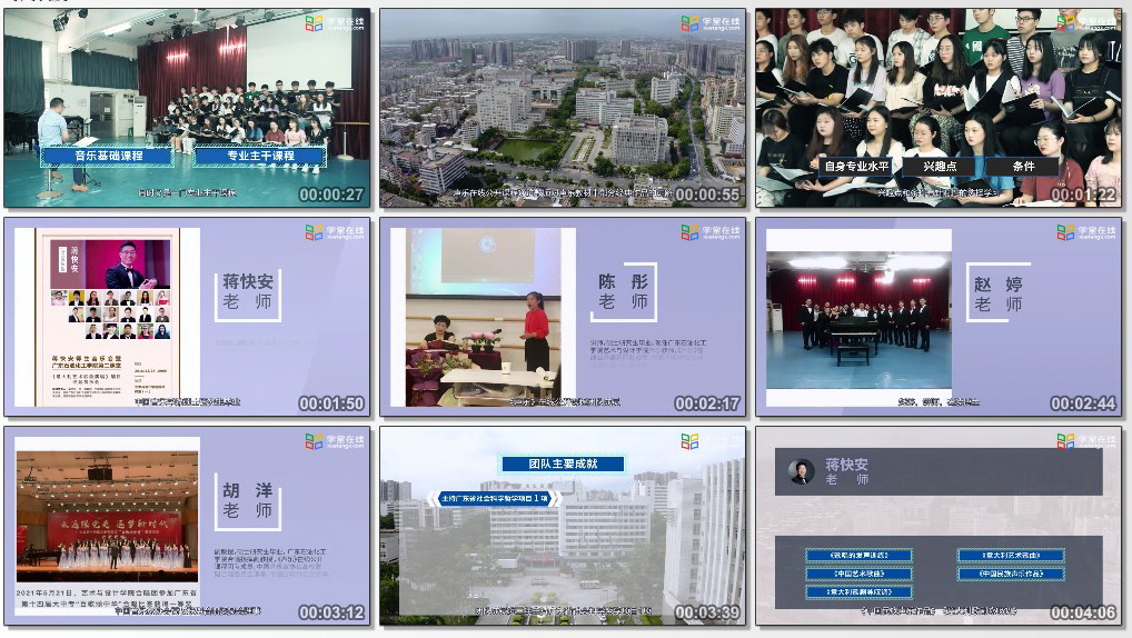 本課程包括十章內容,由40個實踐課堂聲樂教學視頻組成,由廣東石油化工學院藝術與設計學院的5位老師擔任主講,教師們具有豐富的教學與實踐經驗,曾主持和參與多項省級、校級教科研項目;其中課程負責人蔣快安老師擔任《歌唱的發聲訓練》《意大利藝術歌曲》《中國藝術歌曲》《中國民族聲樂作品》《意大利歌劇詠歎調》等章節內容的教學;麥雯老師主要擔任《俄羅斯歌曲、烏克蘭歌曲》內容的演唱及教學;趙婷老師主要擔任《中國民族歌劇詠歎調及片段》內容的演唱與教學;陳彤老師擔任《中國古典詩詞歌曲》內容的演唱與教學,胡洋老師擔任第十章《合唱作品的音色訓練》內容的教學等。