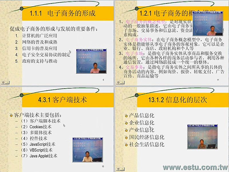 電子商務作為信息學、經濟學、管理學、法學、計算機技術和理工類交叉的一個新興學科,狹義的我們可以理解為在網上進行的交易活動,在當代信息化社會的經濟與建設、金融與商業流通、生產與服務等各類社會活動中都有著廣泛的應用。本套電子商務技術基礎視頻教程由電子科技大學張君雁老師主講,主要內容包括電子商務實現的技術基礎,比如網絡技術,internet技術、www技術、安全技術、支付技術等。