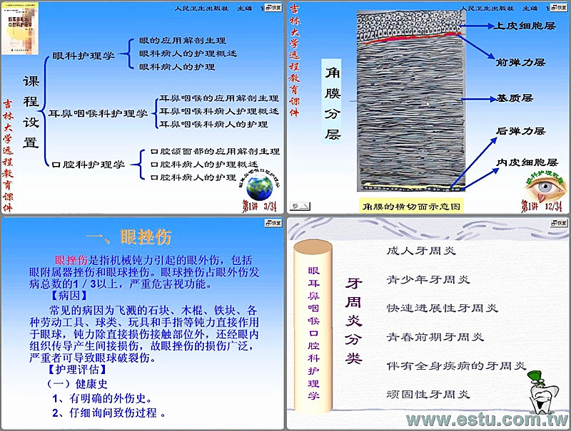 "五官科護理學"課程力求體現最新科研成果和五官科護理學的發展動態。課程分別介紹眼科、耳鼻咽喉科和口腔科護理學內容。除介紹各科應用解剖學、生理學知識外,著重對常.......... |