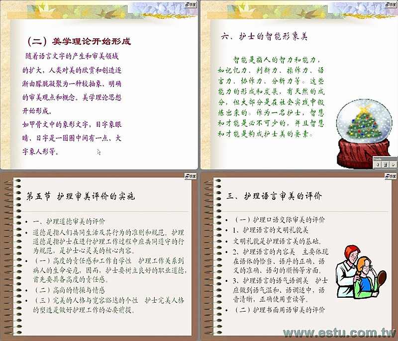 《護理美學》它是將美學基本理論應用於護理實踐的一門新興的邊緣學科。課程的目的就是為了反映護理專業最新進展,通過對護理美學的研究,促使廣大醫學護理學生加強護理審美.......... |